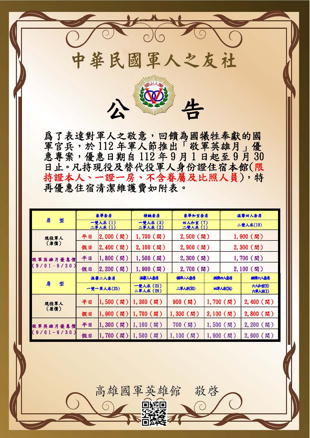 112年軍人節敬軍優惠專案2023-08-03 1. 活動日期:自112年9月1日-9月30日止。 2. 優惠對象:具現役及替代役軍人身分人員。 3. 優惠方式:限持證本人入住,一證件優惠一房間。 附件檔案: 70_1.jpeg
